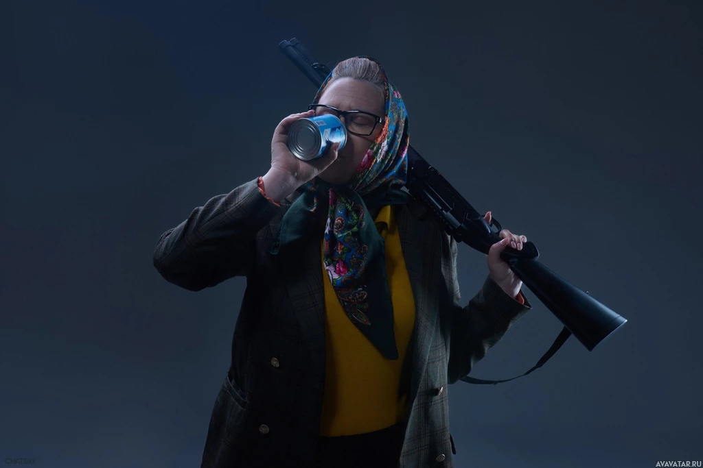 video game. They are holding a weapon that matches the style seen in the game, which suggests they might be engaging in cosplay or celebrating the game's aesthetic. The person is also drinking from a cup, adding to the casual and fun atmosphere captured in the image.