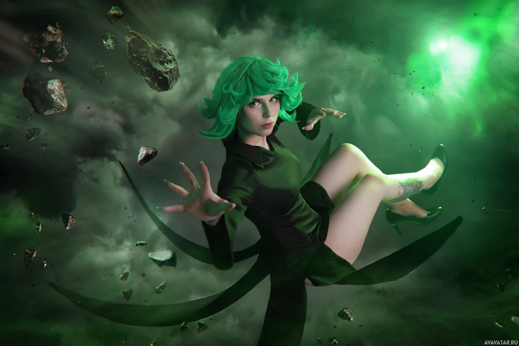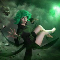 a dynamic pose, suggesting motion or action. Her attire includes elements that resemble leaves, which could indicate a thematic representation of nature. There's also an aura surrounding her head and hands, contributing to the fantastical and energetic atmosphere of the image. The background is dramatic with