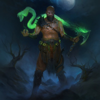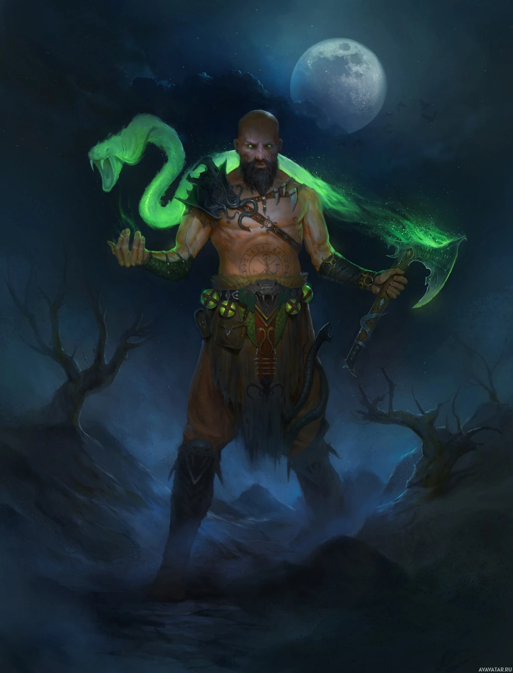 a mystical setting. He is holding an axe in one hand and a staff in the other, suggesting he might be a warrior or adventurer. His attire includes elements that are typical for such characters, with fur adornments and