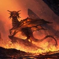 rocky terrain that appears to be on fire, suggesting a fiery or volcanic environment. There are flames visible in the background, adding to