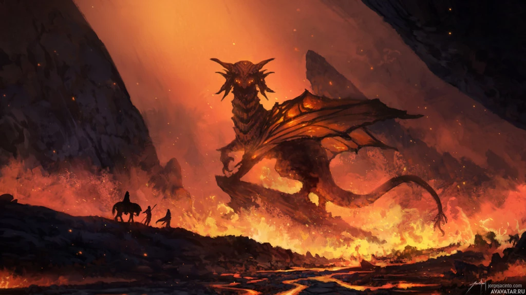 the intensity of the scene. In front of the dragon, there are two individuals riding horses; they seem to be looking up at the dragon with