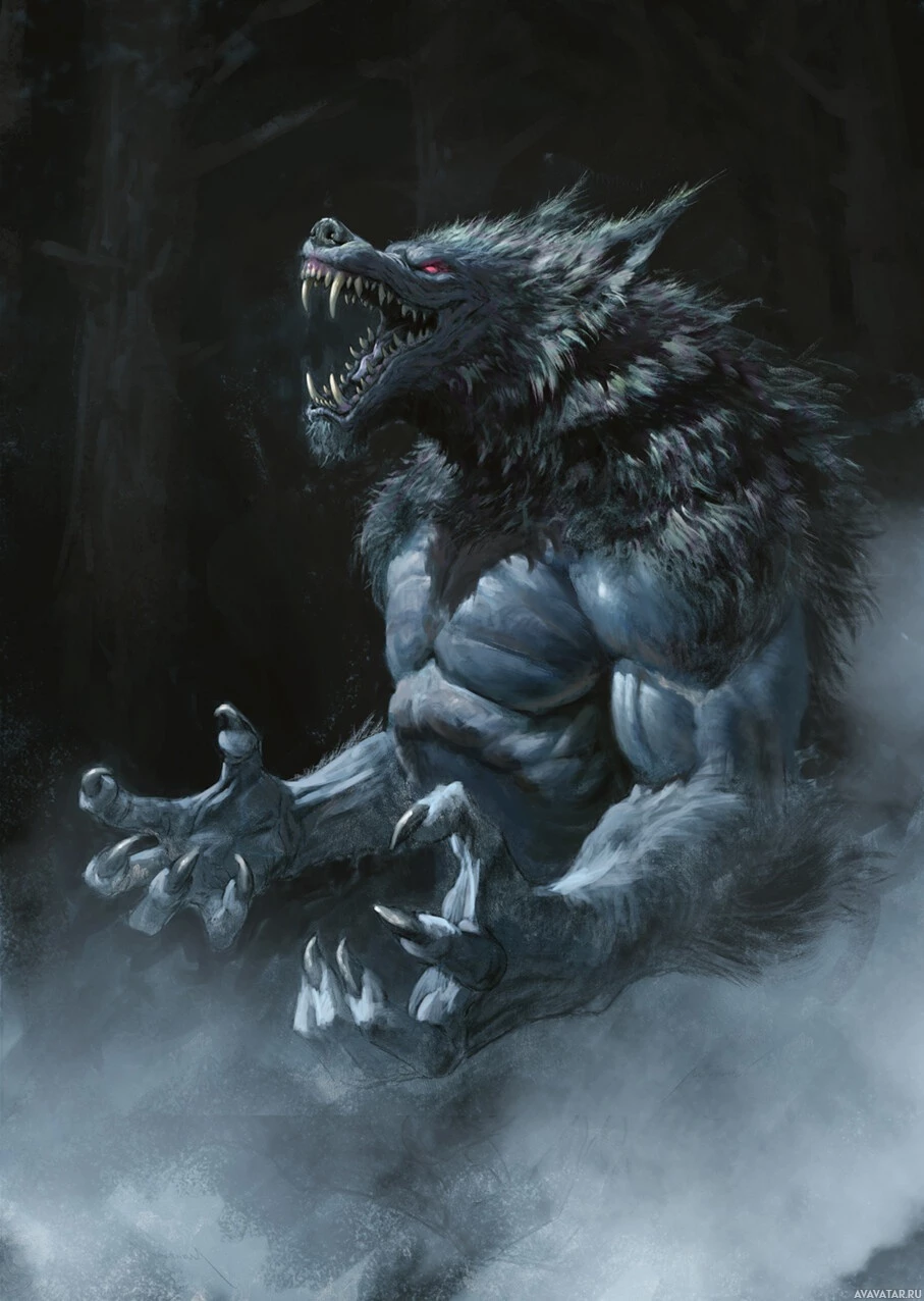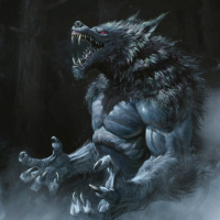 werewolf character. It shows the werewolf in an intense and somewhat menacing pose, with its mouth open as if growling or snarling. The creature is anthropomorphic, suggesting a blend of human and wolf characteristics, which are common traits for werewolves in