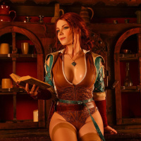 the video game "The Witcher 3: Wild Hunt," specifically Triss Merigold, portrayed by the cosplayer in costume. She is seated and appears to be reading a book with her hand resting on it. The setting suggests an alchemist's shop or laboratory, as indicated by