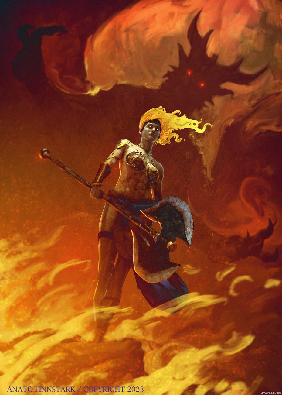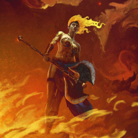 a female figure with golden hair, standing confidently in the center of the frame. She holds an axe in her right hand and wears what looks like armor adorned with skulls. In the background, there are dramatic flames and smoke, suggesting she might be in a volcanic or fiery environment, possibly representing