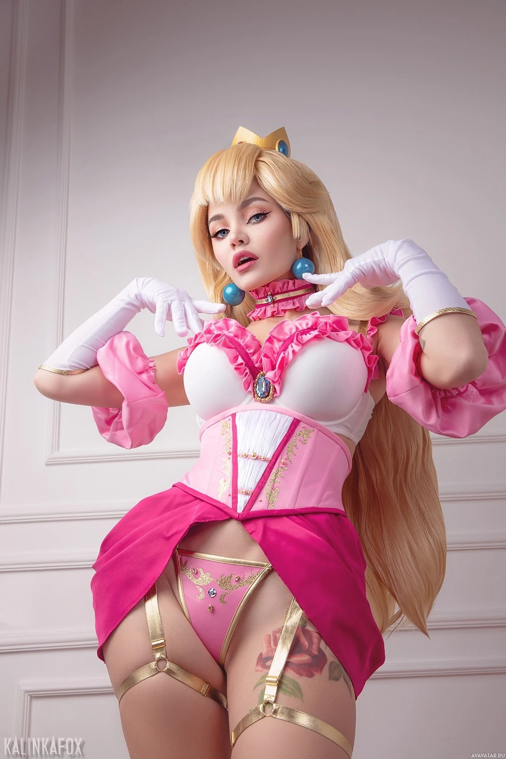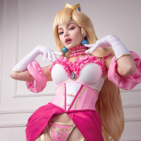 The image shows a person dressed in a costume that is reminiscent of Princess Peach from the Nintendo