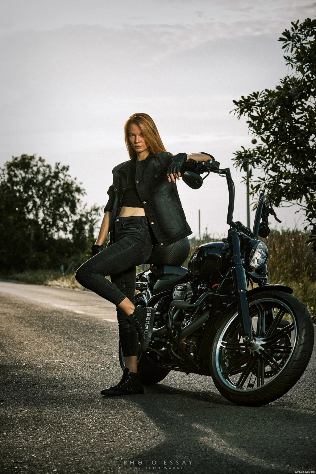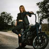 The image shows a woman sitting on a motorcycle. She appears to be wearing