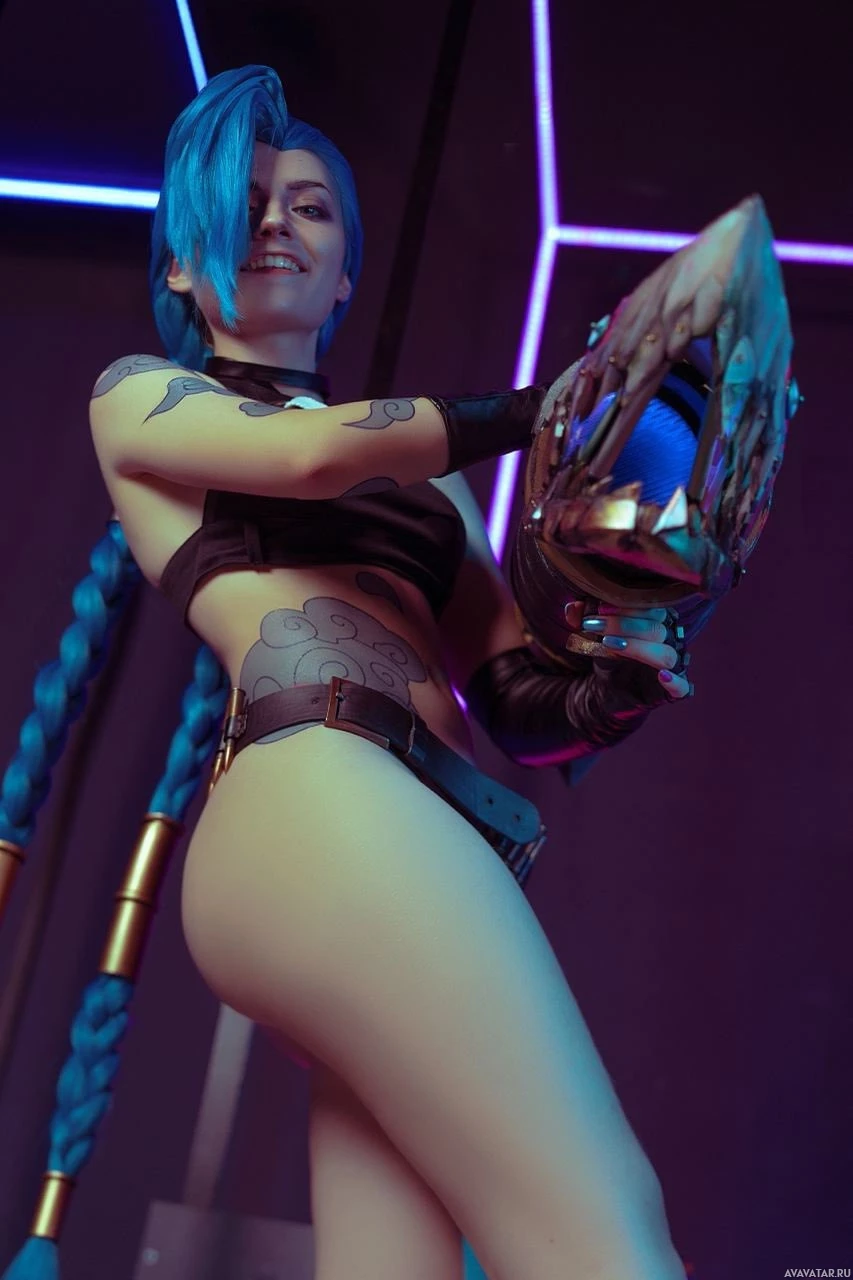 The image shows a character from the game "League of Legends," specifically Jinx, as indicated by her distinctive