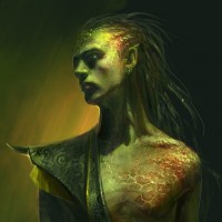 intricate armor or clothing that seems to be made of metal, possibly silver or steel. The armor includes detailed embellishments and is worn with a cape or robe draped over one shoulder. His left hand holds a sword, suggesting he may have a warrior or combatant role within his narrative. The background is a dark color with hints of green, which could indicate a mossy or forest environment often associated with fantasy settings. The overall mood of the image is somber and contemplative.