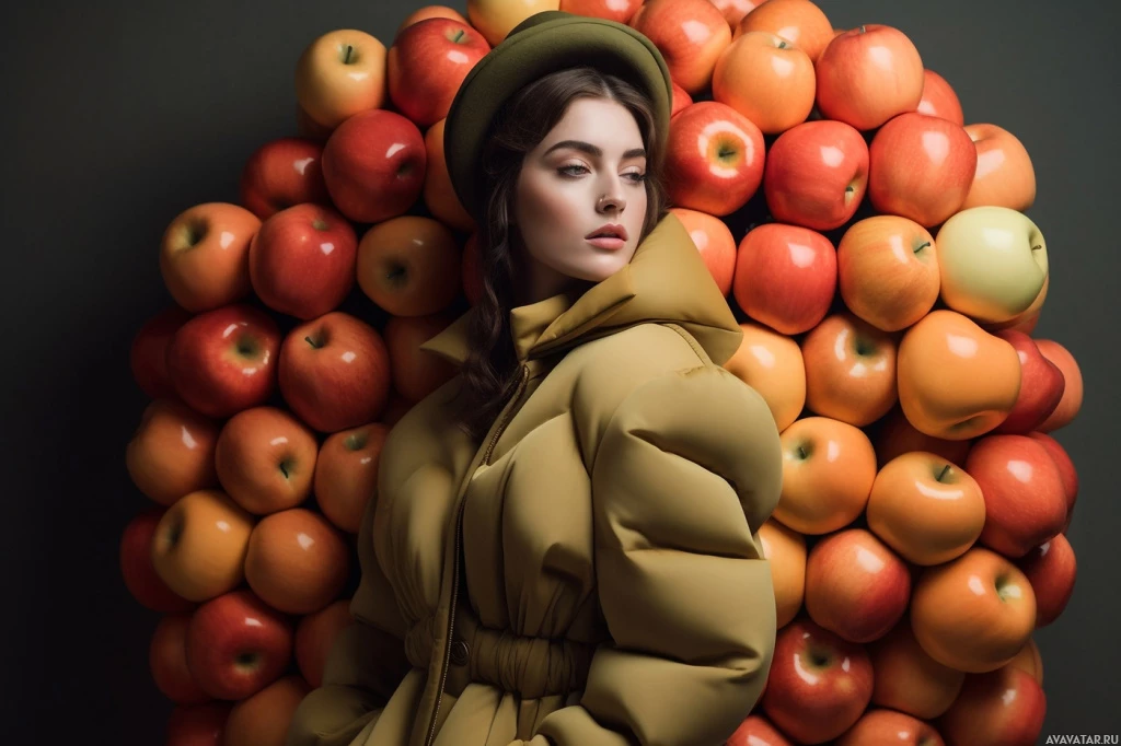 fashion trend. Her pose and the arrangement of the apples give the composition an artistic touch, possibly for a fashion shoot or a conceptual