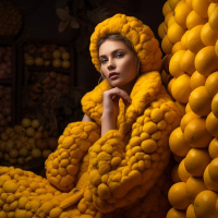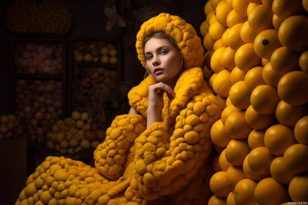 citrus fruits. The individual is wearing a costume or clothing that resembles the appearance of lemons, creating