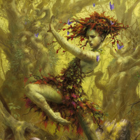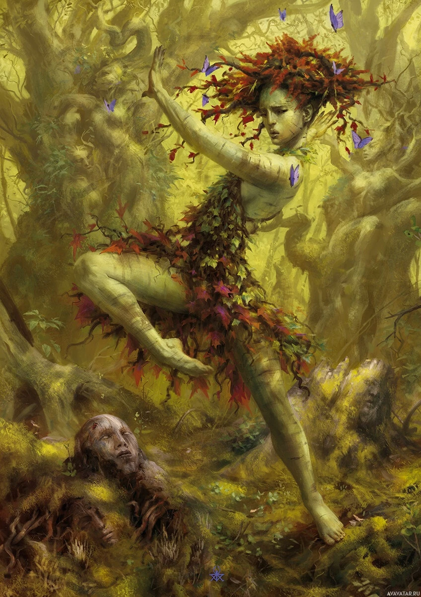 a mythological being that is typically associated with trees or woodland areas. In this artwork, the dryad appears to be dancing or interacting with nature, surrounded by