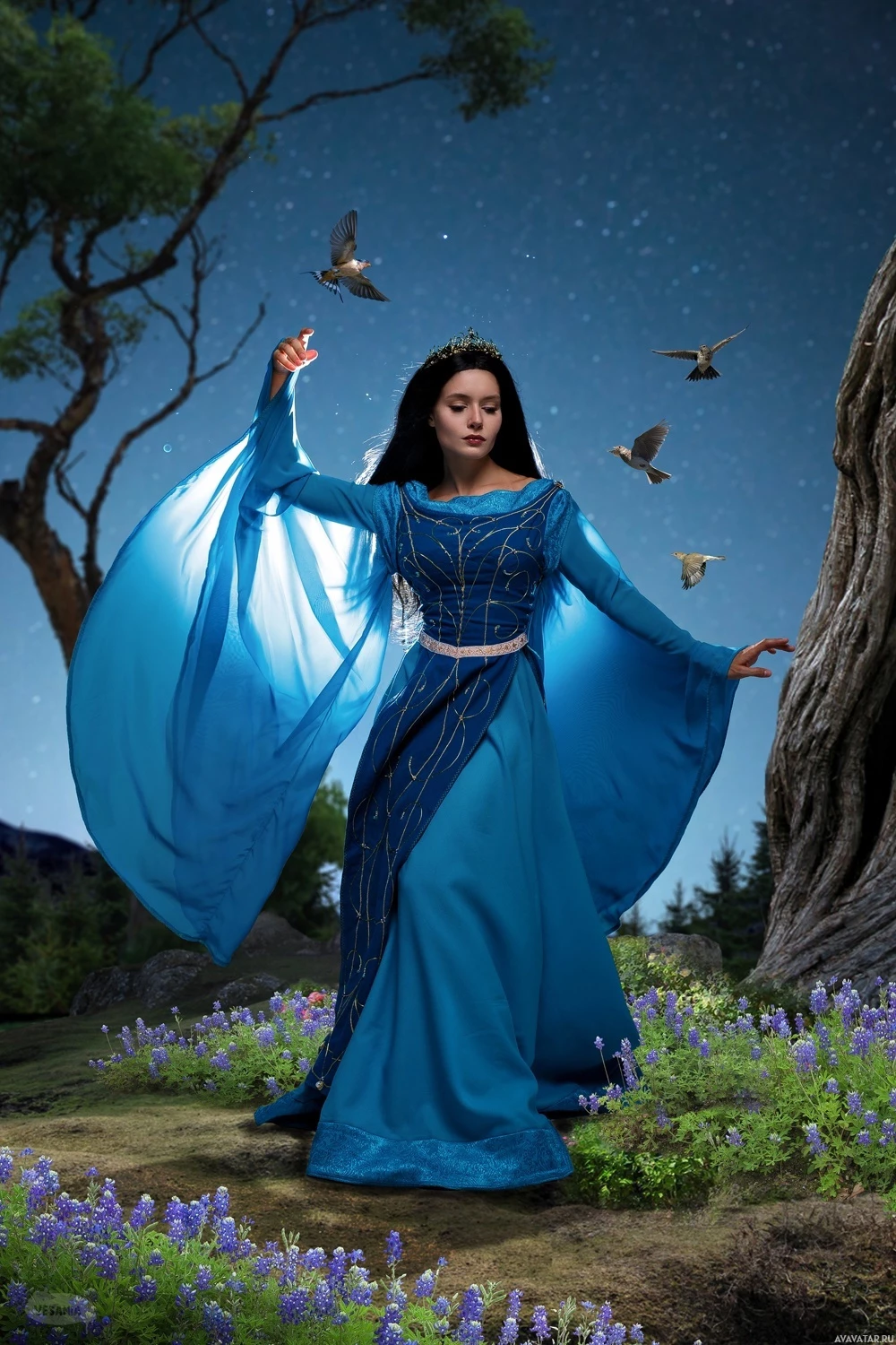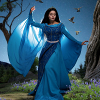 long hair and is wearing a blue dress with flowing sleeves and an elaborate design, which suggests a magical or enchanted theme. Around them are elements that might be part of a fantasy setting like a rocky outcrop, trees, and