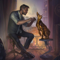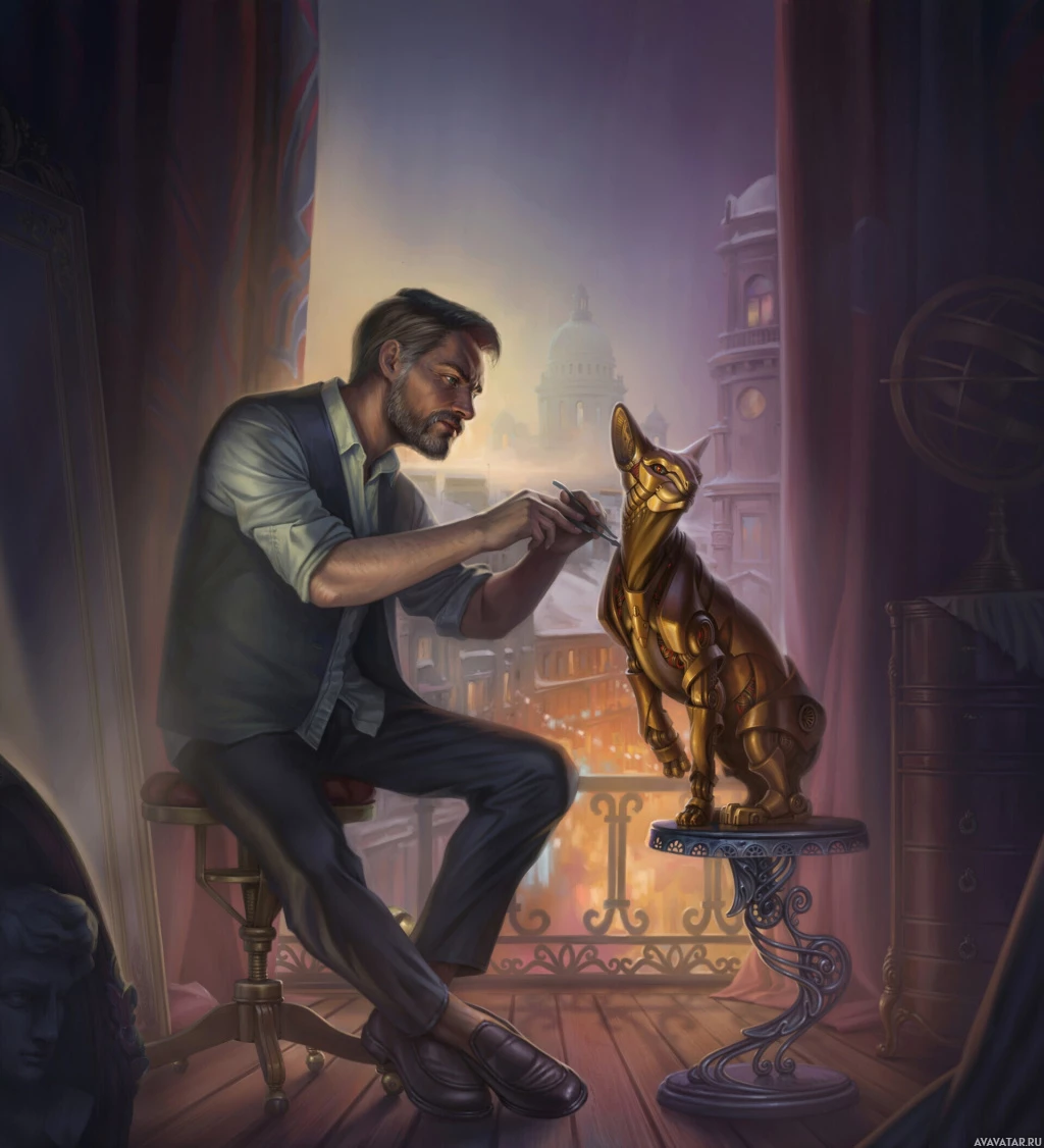 actual cat in this picture; instead, there's a statue of a lion on the floor. The setting suggests an interior space, possibly a study or workshop, with