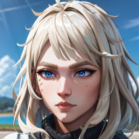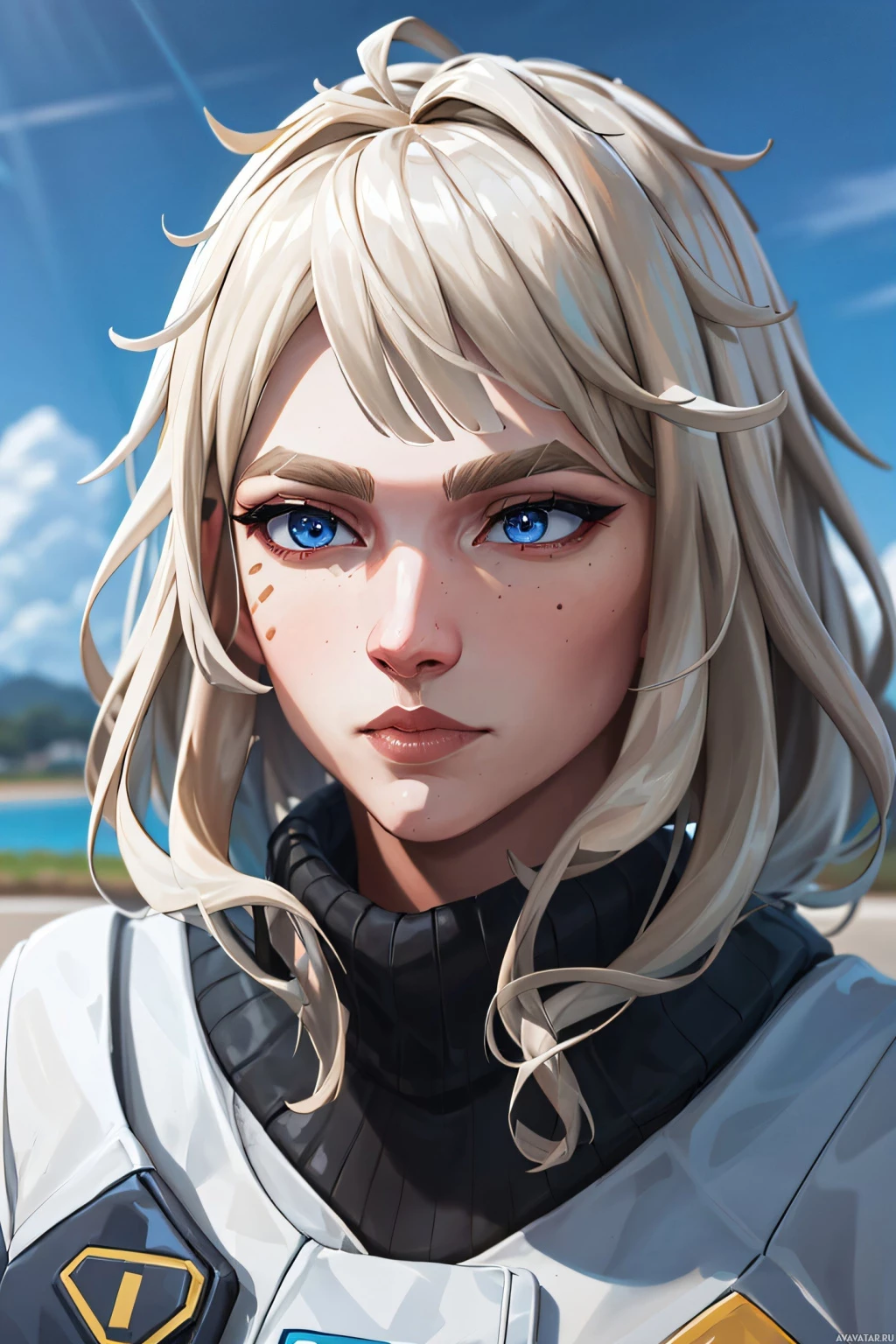 white hair and blue eyes. She has a serious expression on her face and is wearing what looks like a space suit or astronaut's gear, suggesting she may be depicted as an astronaut or a character from