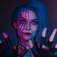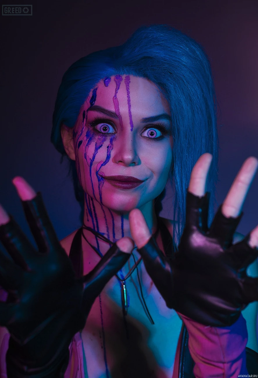 The image depicts a person dressed in costume, likely cosplaying as Jinx from the game