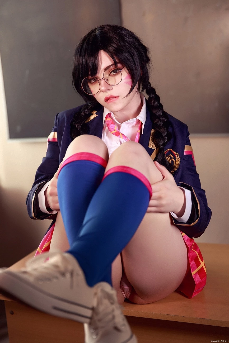 a young woman sitting on what appears to be a desk or table in an indoor setting. She has
