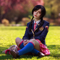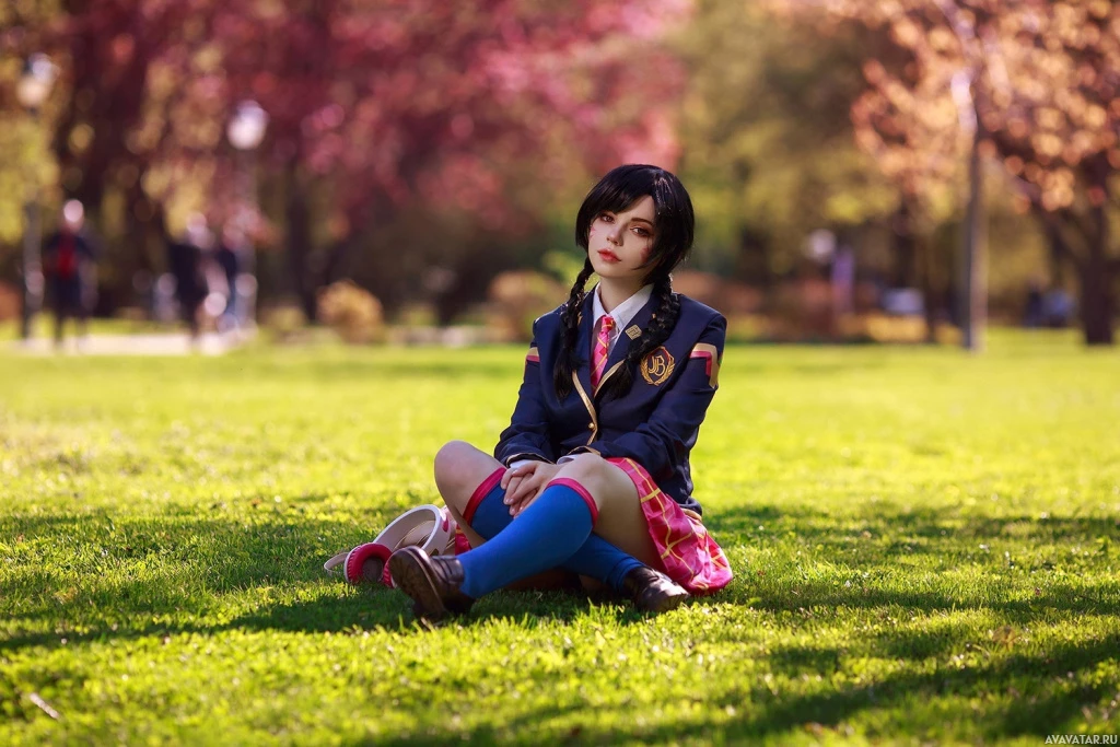 На картинке изображена молодая женщина с каштановыми волосами, сидящая на траве. На ней, судя по всему, школьная форма, включающая блейзер и галстук. Перед ней небольшой участок травы, а на заднем плане видны деревья. Вдалеке прогуливаются и другие люди.