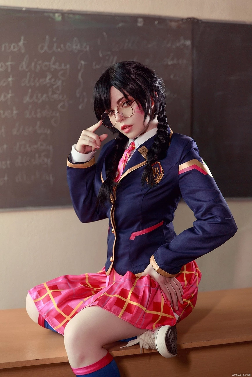 a school uniform, which includes a blazer, tie, and skirt. She has long