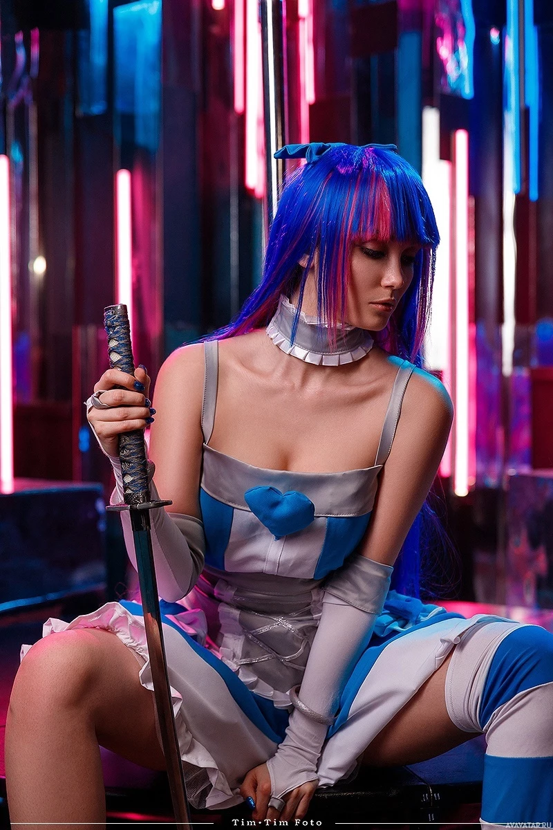 blue hair, wearing a costume that includes a blouse and skirt with a color scheme of white and blue. They are also holding a sword in one hand, which adds to the fantasy or cosplay theme of their attire. The background suggests