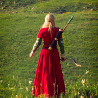 a grassy hillside. This individual appears to be wearing a long red dress and has