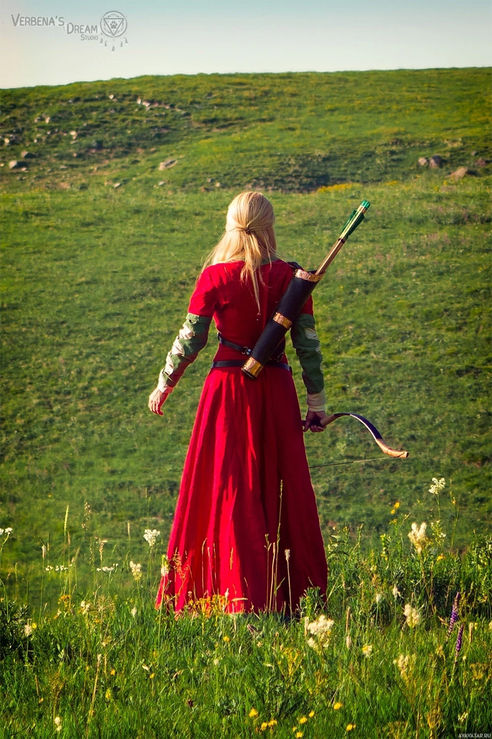 blonde hair. They are holding a bow in one hand and what seems to be an arrow in the other. The backdrop suggests