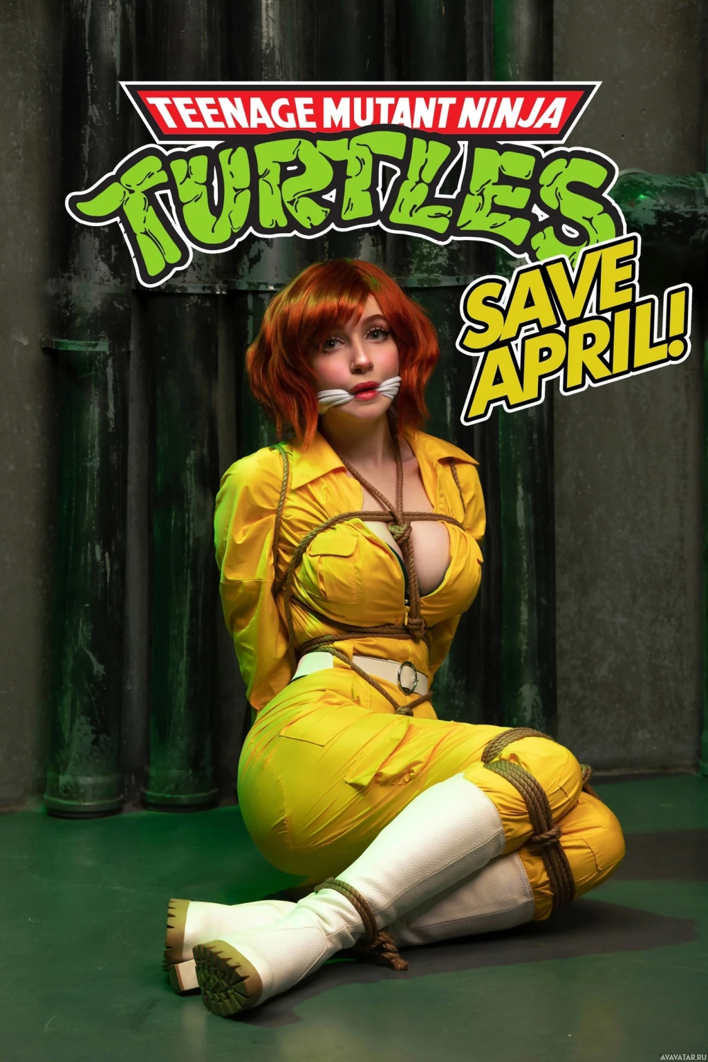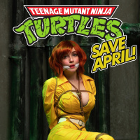 Mutant Ninja Turtles," which is the name of the franchise, and below it, "SAVE APRIL!" along with a graphic design element that includes the word "April" in red letters, reinforcing the theme of cosplay for April O'Neil.