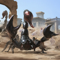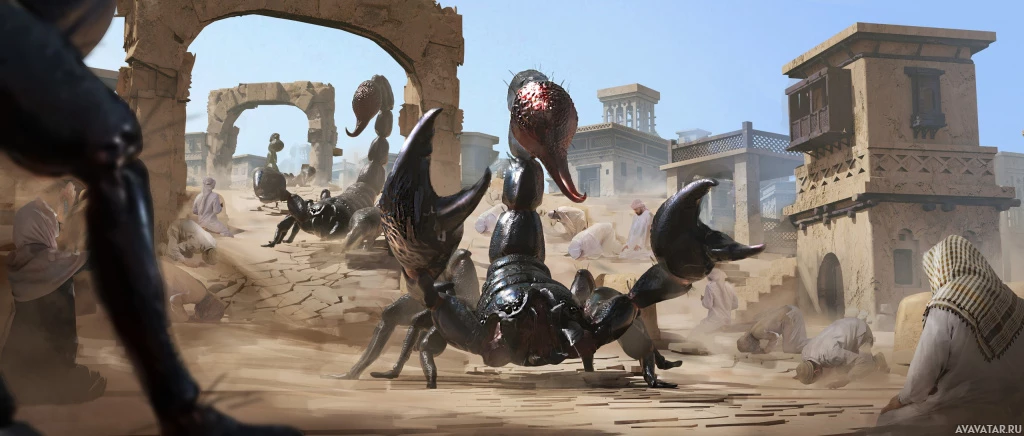 the midst of the action, there appears to be an animal that could be identified as a scorpion. There are also