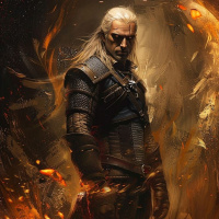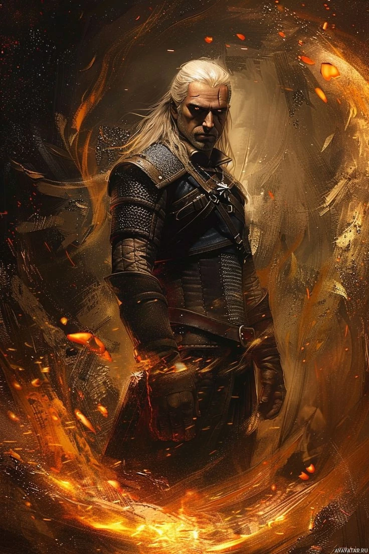 signature armor and holding his sword, which suggests he may be preparing for battle or confrontation. The background has a dynamic and fiery appearance, possibly indicating that there's an element of danger or combat nearby. This image captures the intensity and fantasy elements associated with Geralt's character in