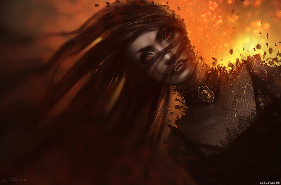 a fantasy scene, possibly involving vampires or characters with vampiric traits. There is a figure that appears to be a woman with