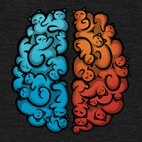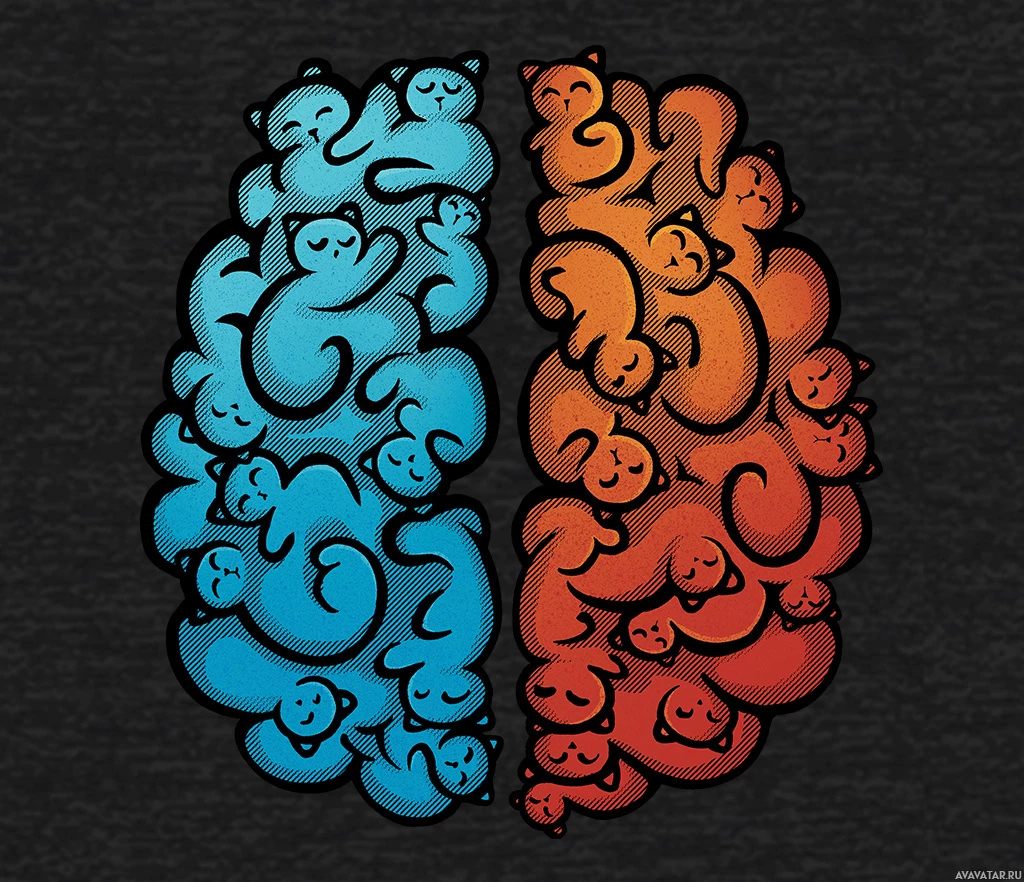 human brains, each with a unique color and filled with cartoon-style cats. The left brain is colored orange, while the right brain is blue. Both brains are adorned with white cat silhouettes peeking out from the top and bottom regions, giving the impression that the cats are in the process of being "born" or having just been "hatched" from these symbolic representations of human