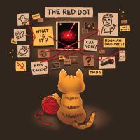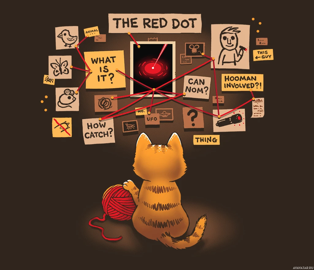 RED DOT," "What is it?", "Thing?" and other questions or statements that seem to be part of a conspiracy theory or detective investigation. There's also an image on the screen that looks like a red dot being watched by another figure. The cat appears to be looking at the screen, possibly following the sticky note