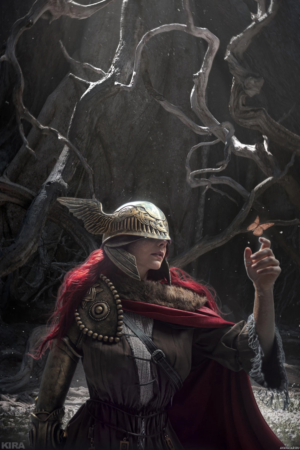 mysterious environment with twisted tree trunks, which might suggest a scene from the game itself or a creative interpretation of it by the cosplayer. Malenia is a central figure in "