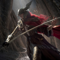 a dynamic pose as if they are either attacking or preparing to defend themselves. The setting looks like it could be a dungeon or cathedral due to