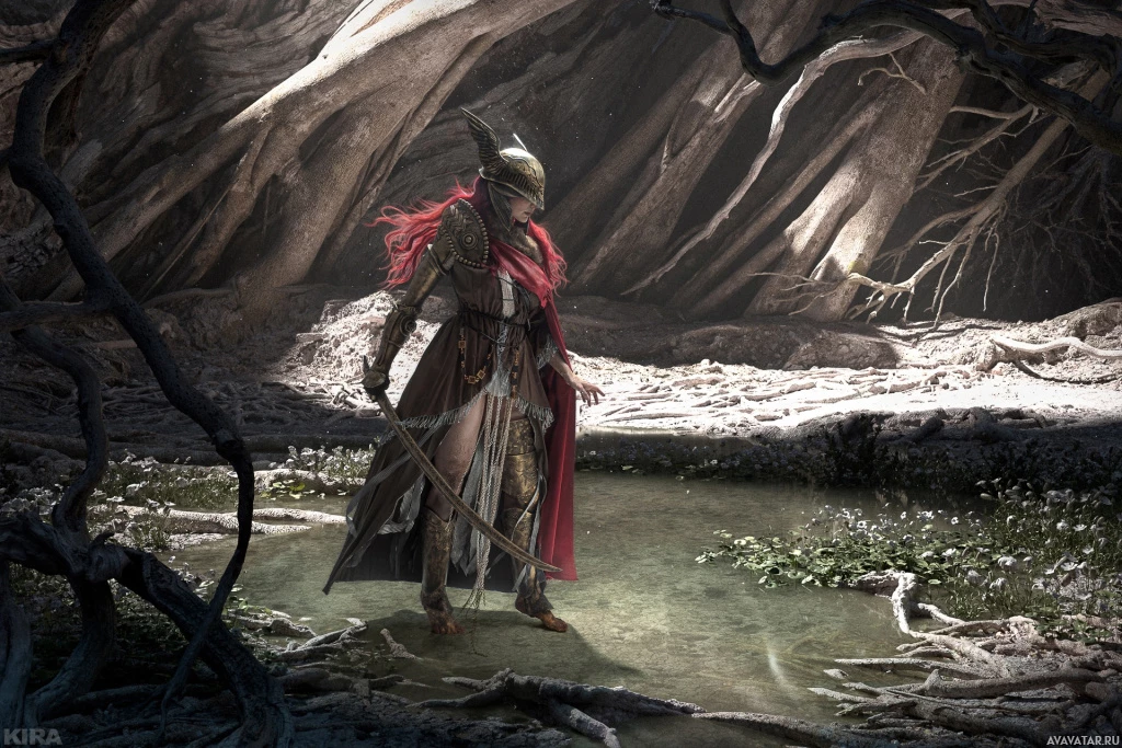 the video game "Elden Ring." This character is known for their distinct armor and helmet, which are typically associated with a knight or