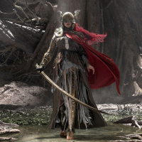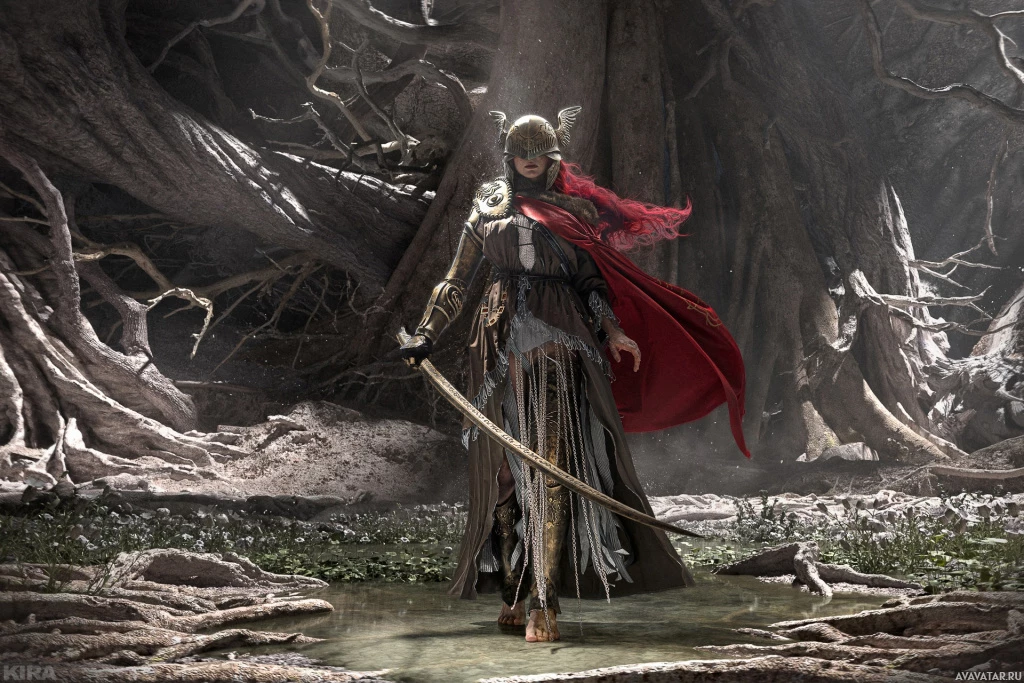 На картинке изображен персонаж из видеоигры "Кольцо Элдена". Этот персонаж изображен как Маления, Клинок Микеллы. Она одета в доспехи и держит меч, стоя в лесистой местности с искривленными деревьями, напоминающими корни. Этот персонаж известен своими мощными способностями и как один из главных антагонистов в игре.