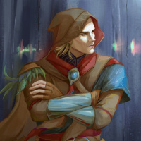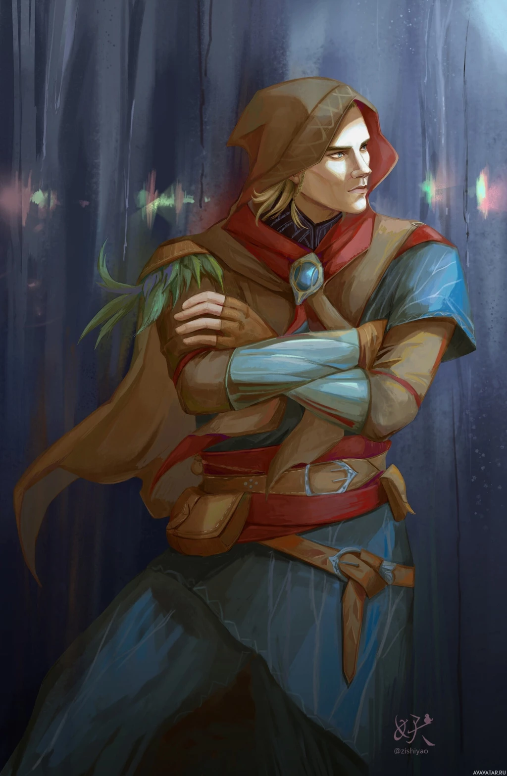 game series. The character is an elf, identifiable by the pointed ears and hooded attire typical of elves in this