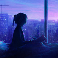 the night sky. There's a cat next to her, also looking out the window. The scene has a cozy and introspective vibe, suggesting that she might be reading or enjoying some