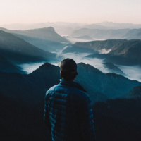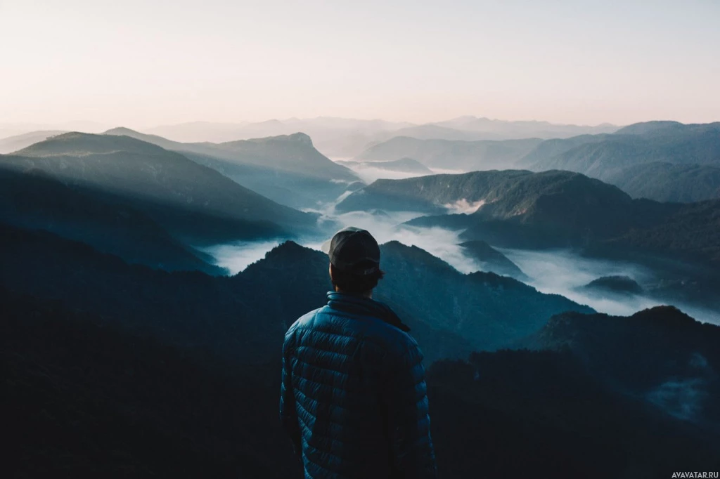 a mountain ridge with their back turned to the camera. They appear to be gazing out over