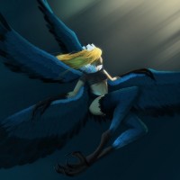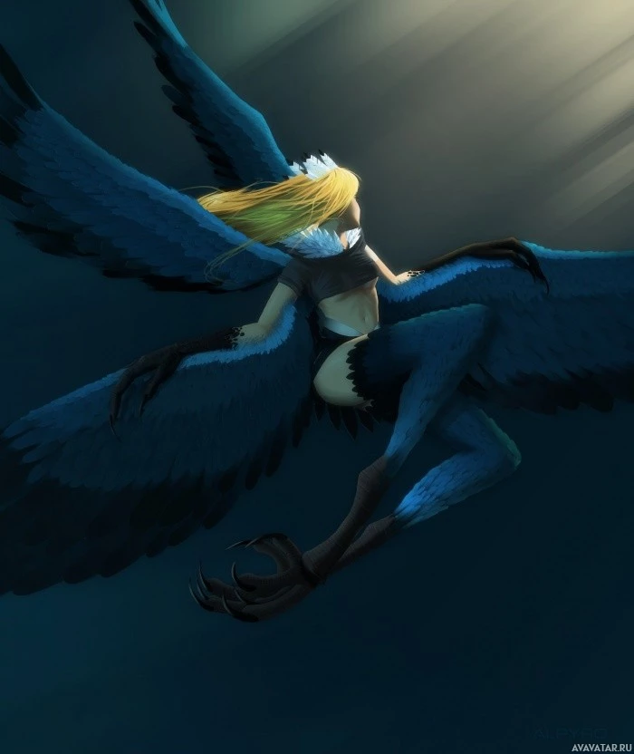 a female figure with wings and birdlike traits, such as feathers and talons, integrated into her form. She appears to be flying through a dark or