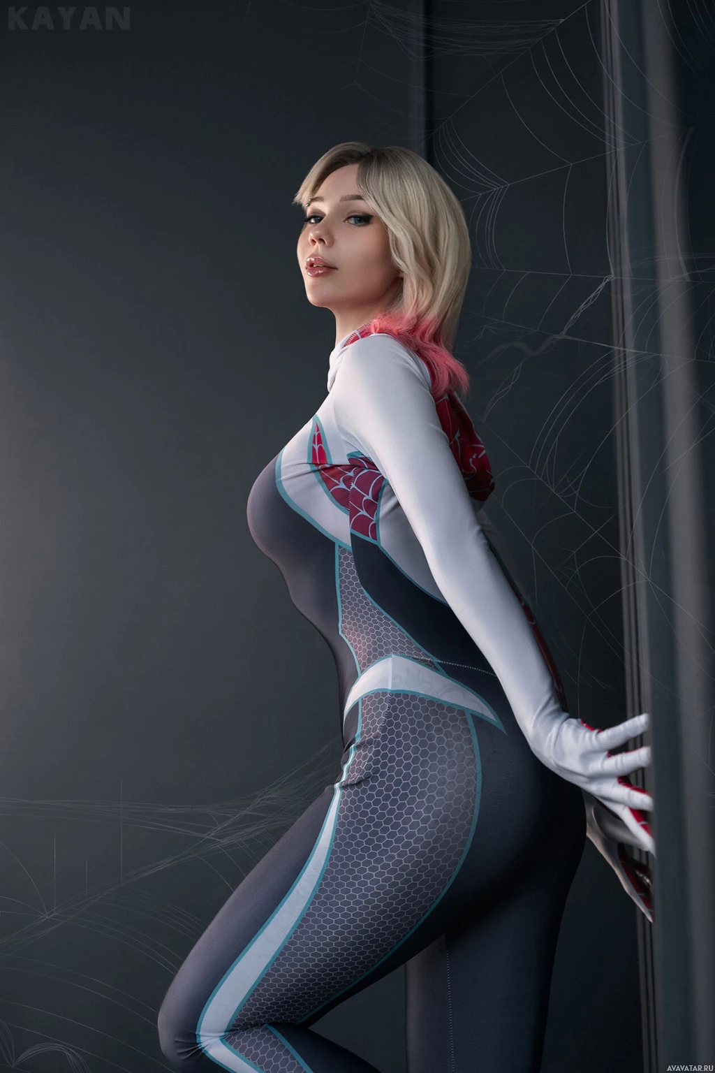 a body suit with blue and white color patterns, which resembles the costume worn by Gwen Stacy in various Spider-Man media. The cosplayer is standing against a backdrop that gives