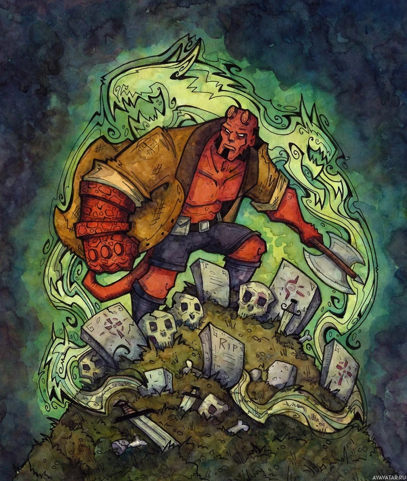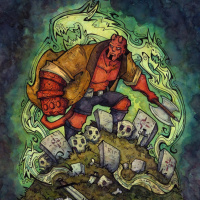 ghostly figures and green flames, which contribute to a supernatural or fantasy theme. The background includes what appears to be gravestones and decaying vegetation, further emphasizing the dark or eerie setting. This image is an artistic representation and not directly related to any real-