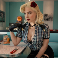 blonde hair styled in curls, and they are wearing makeup that enhances their feminine features. The setting appears to be a diner-style restaurant with a retro ambiance, as suggested by the design of the chairs and