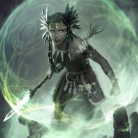 Картинка показывает фантастического персонажа, владеющего копьем. Этот персонаж находится в динамической позе, предполагая действие или движение. Сеттинг кажется волшебным или мистическим, со светящейся зеленой энергией и камнями, которые могут быть частью вулканической или подземной среды.