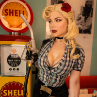 lip color, which is typical of that era's fashion. The individual is holding what appears to be a gas pump handle from a Shell station, as indicated by the recognizable