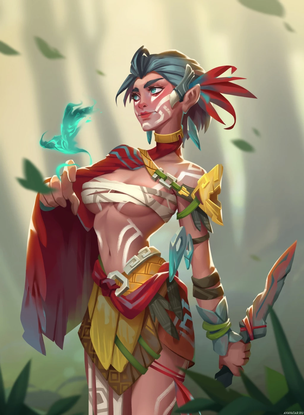 fantasy genres. They have tattoos on their arms and face, suggesting a tribal or warrior-like appearance. The character is wearing armor and holding a weapon, which could indicate that they are either a warrior or a guardian of some sort within their world. The environment looks like a forest with misty conditions, adding to