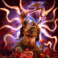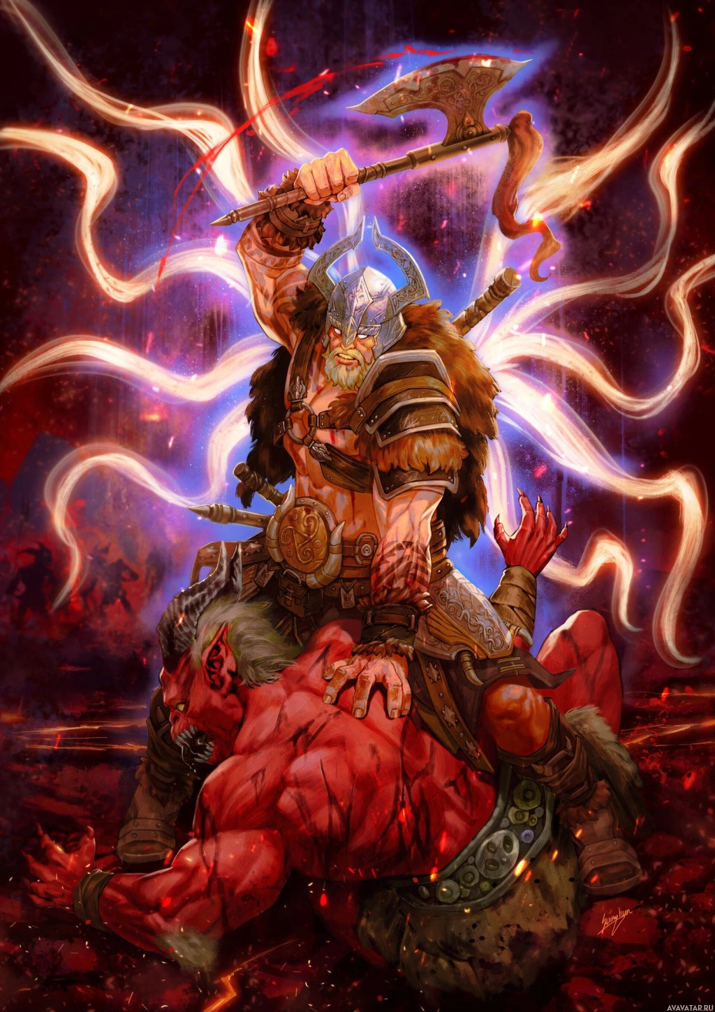 an illustrated character that appears to be a warrior. The warrior is depicted holding an axe and riding on the back of a creature, which looks like a demonic or mythical being with horns and