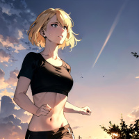 an urban setting during either sunrise or sunset, given the warm lighting that suggests the time of day. This style of artwork is commonly associated with anime or manga illustrations.