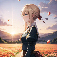a young woman with blonde hair and blue eyes. She is depicted in a stylized anime art style, wearing a detailed outfit that suggests she may be a part of a fantasy or