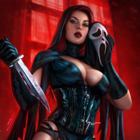 a black outfit, reminiscent of gothic or horror themes. She is wearing a mask over the eyes and has her body angled to one side while holding a knife pointed downwards with her left hand. Her expression appears seductive or menacing. The overall tone of the image suggests it might be inspired by