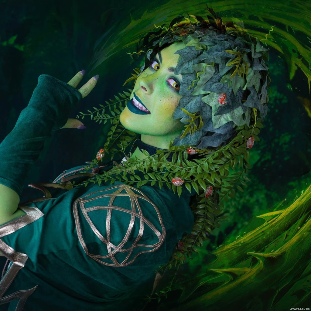 elaborate fantasy-themed attire. They have green makeup on their face and body, giving them the appearance of a dryad from mythology or fantasy lore, which are beings associated with trees in